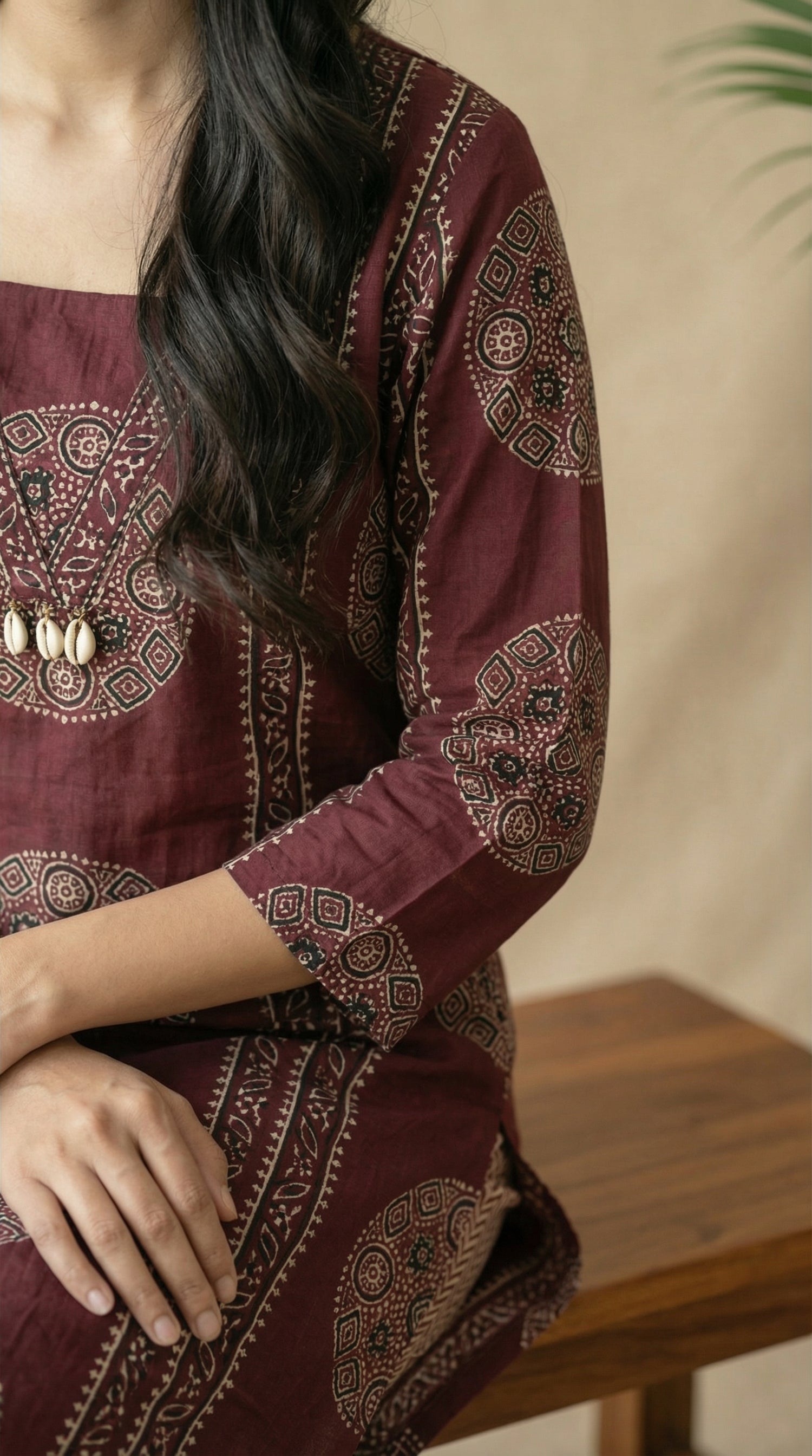 Maroon Printed Pure Cotton A-Line Kurta Set with Dupatta
