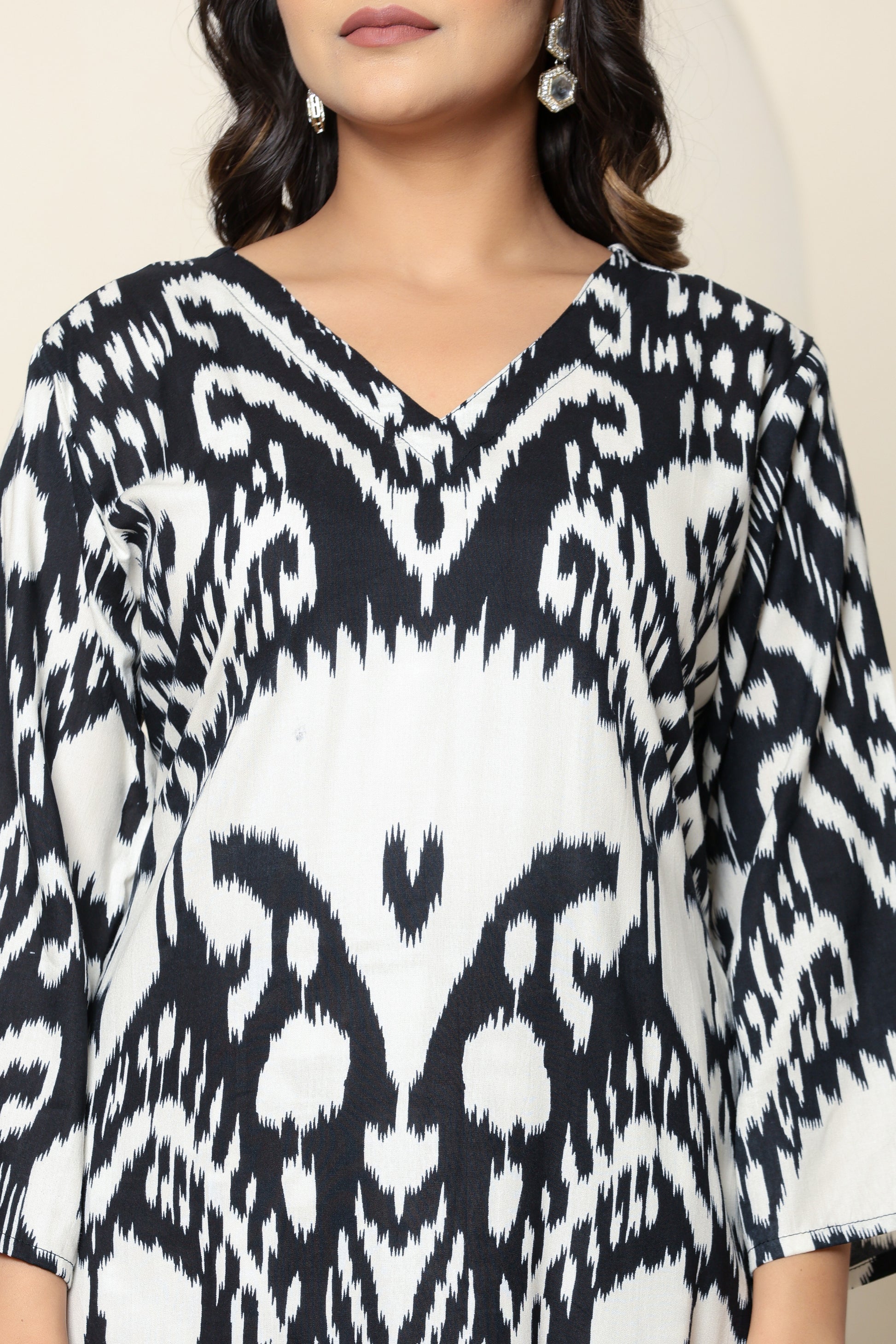 Elegant black solid palazzo suit set crafted from breathable cotton voile. The two-piece set features a V-neck kurta with ikat print and palazzo pants, perfect for casual ethnic styling.