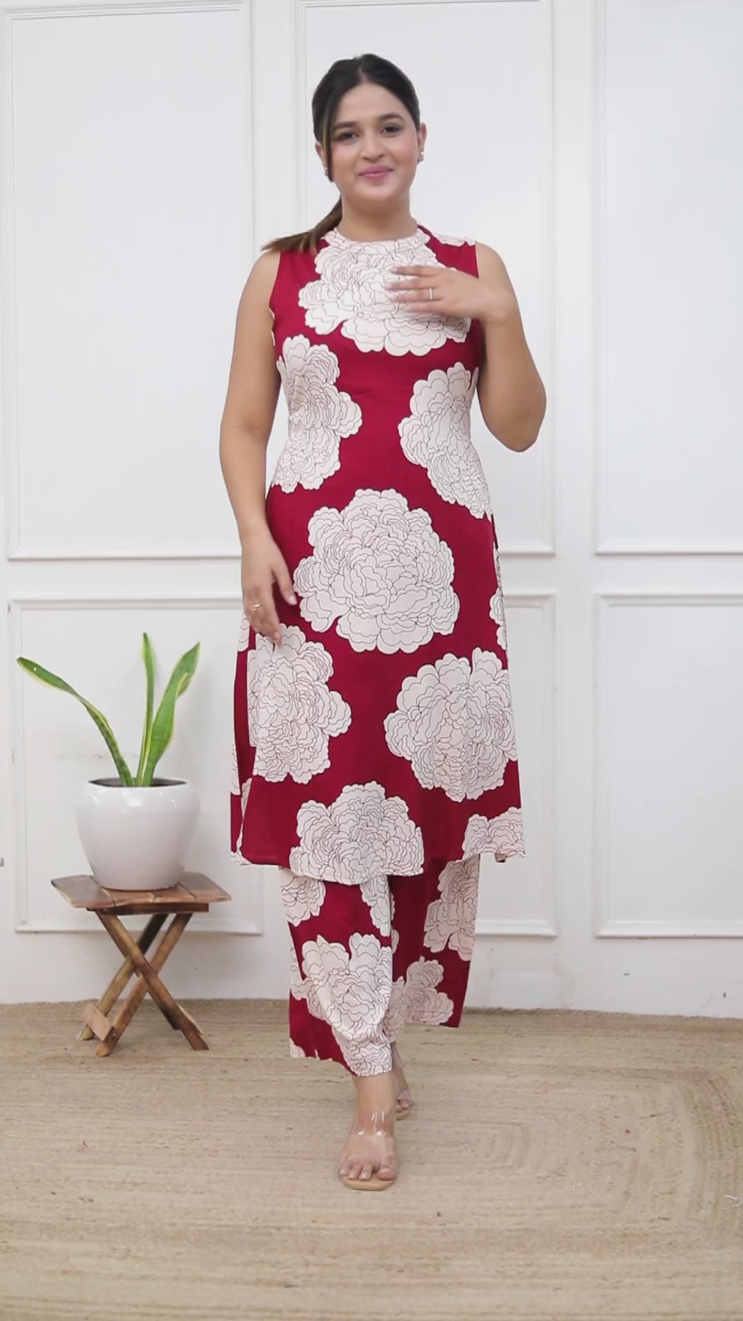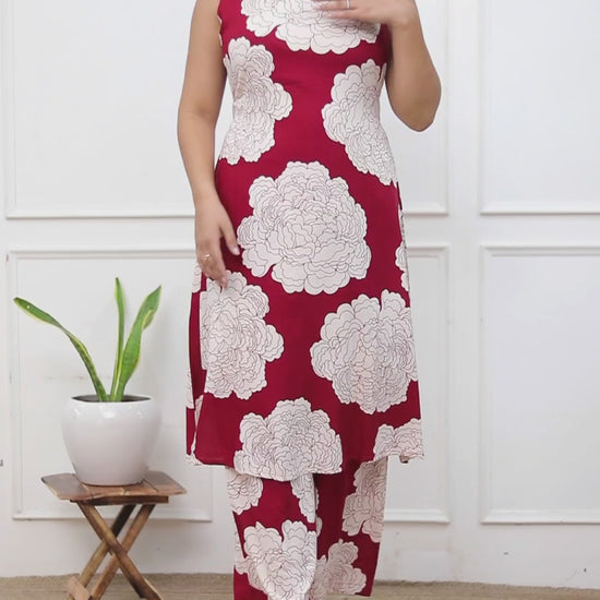 Crafted from soft rayon, this maroon floral co-ord set features a straight kurta with attachable sleeves and matching palazzos with pockets. Perfect for festive nights and graceful gatherings.