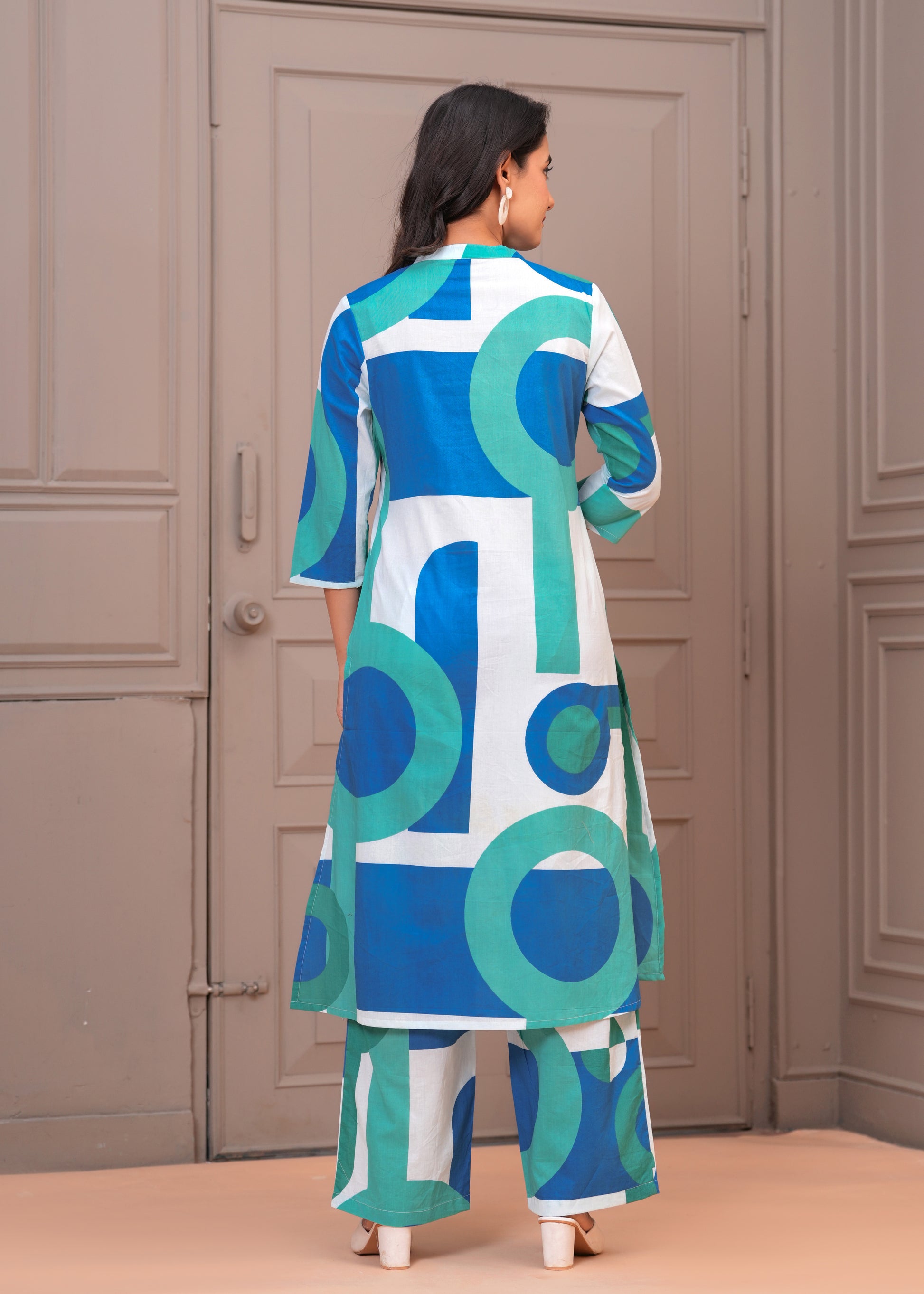 Stand out in festive gatherings with this vibrant multicolor geometric palazzo suit set, crafted from soft cotton for lasting comfort. The band collar kurta and ankle-length palazzo pants feature striking geometric prints, offering an effortless fusion of tradition and modernity for casual or ethnic outings.