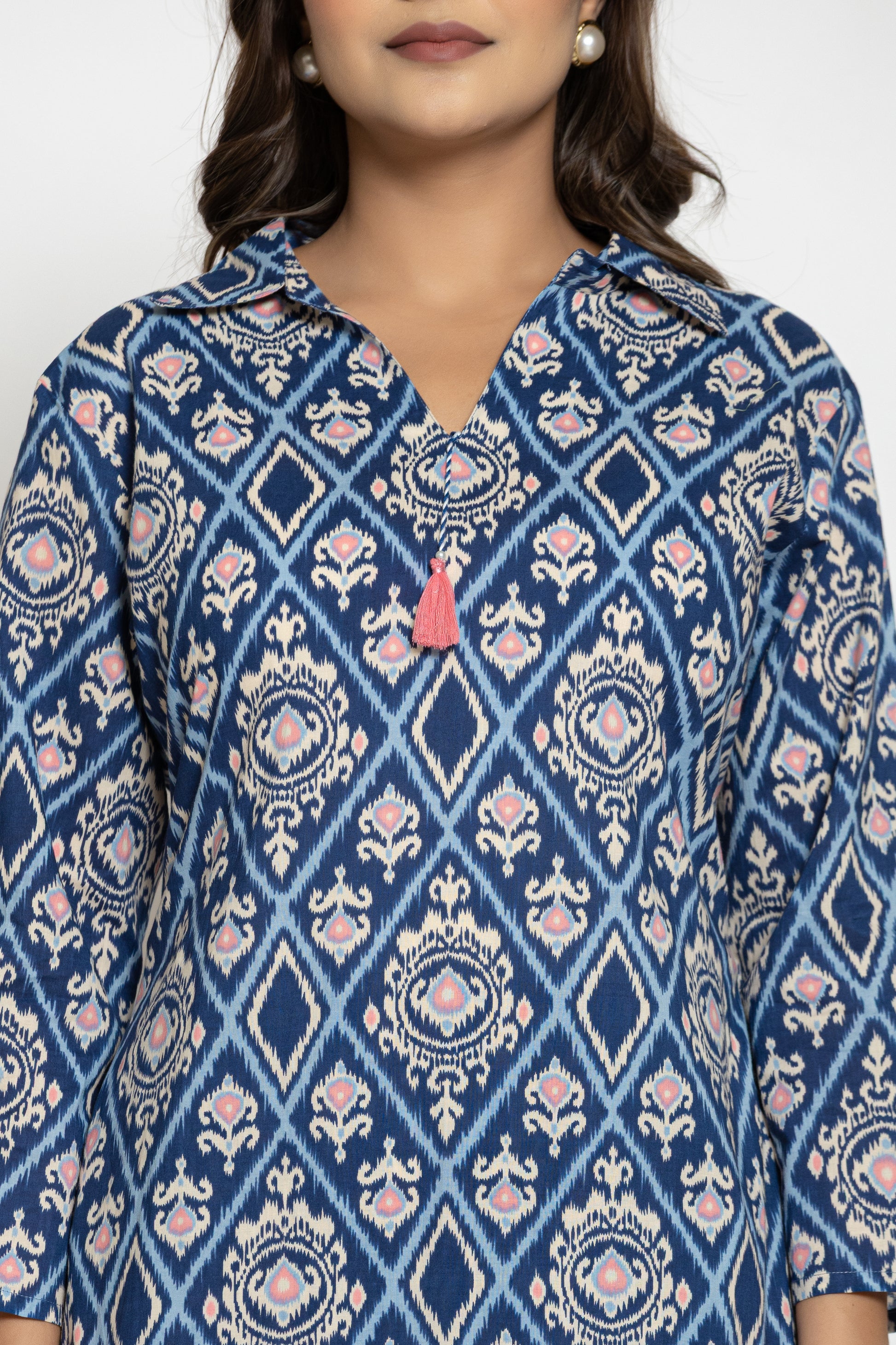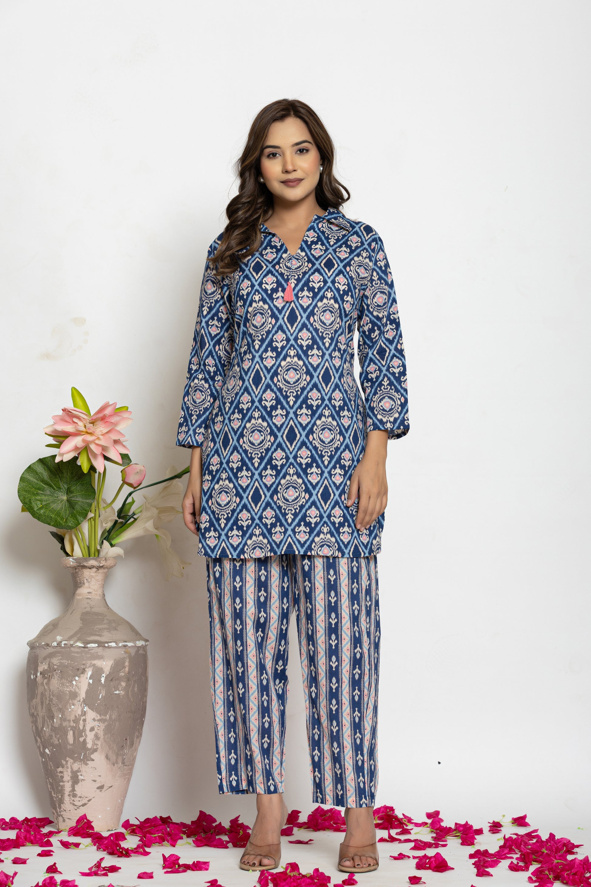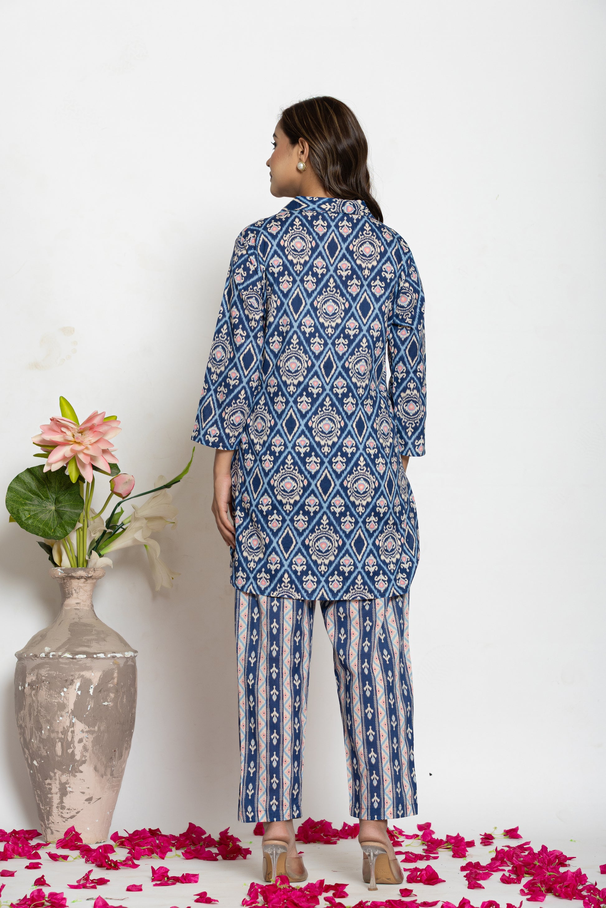 Navy Blue Abstract Palazzo Suit Set with Tassels