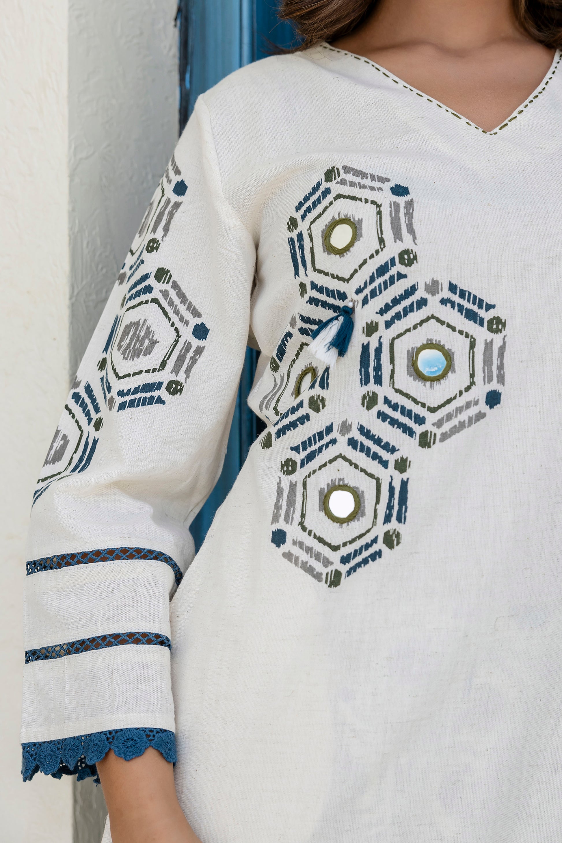 Grace meets comfort in this off white geometric palazzo suit set made from premium khadi cotton. With its V-neck kurta, lace and mirror embellishments, and matching palazzo pants, it's perfect for festive evenings and stylish casual dressing.