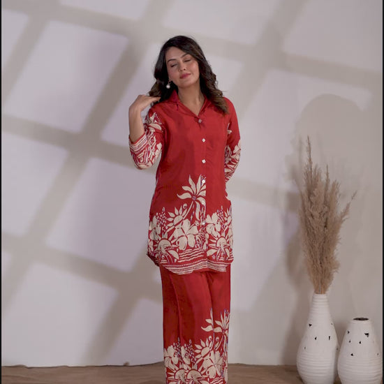 Stylish rusty orange floral palazzo suit set in chanderi fabric. Includes a mandarin collar kurta with floral print and palazzo pants, accented with buttons. Perfect for festive and casual celebrations.