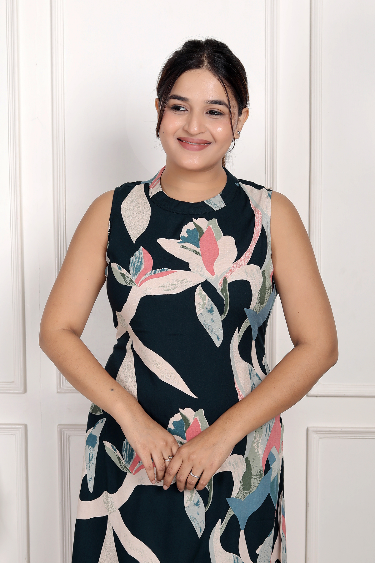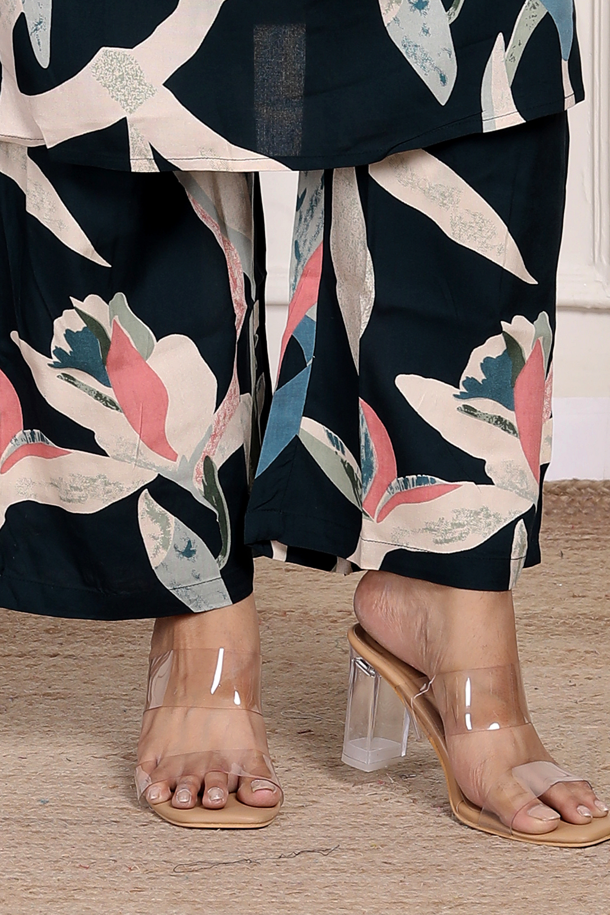 Designed for modern wardrobes, this navy abstract rayon co-ord set pairs a stylish kurta with palazzos for a mix of elegance and ease.